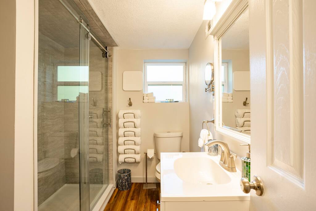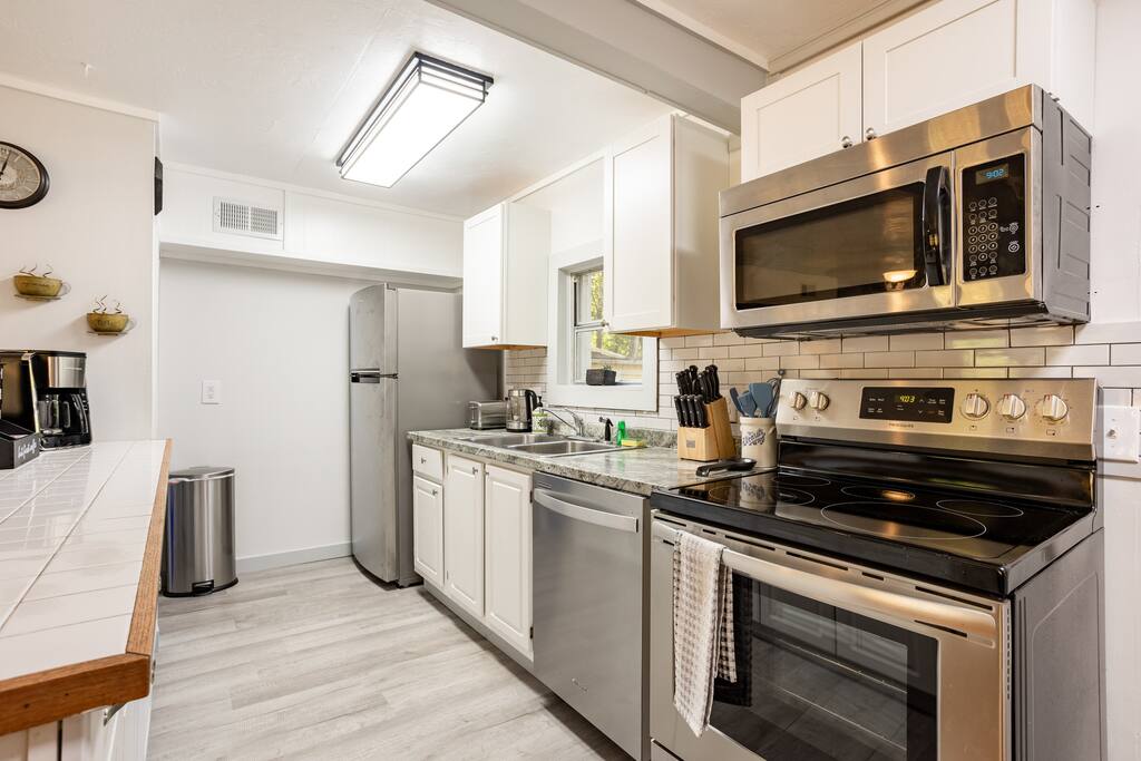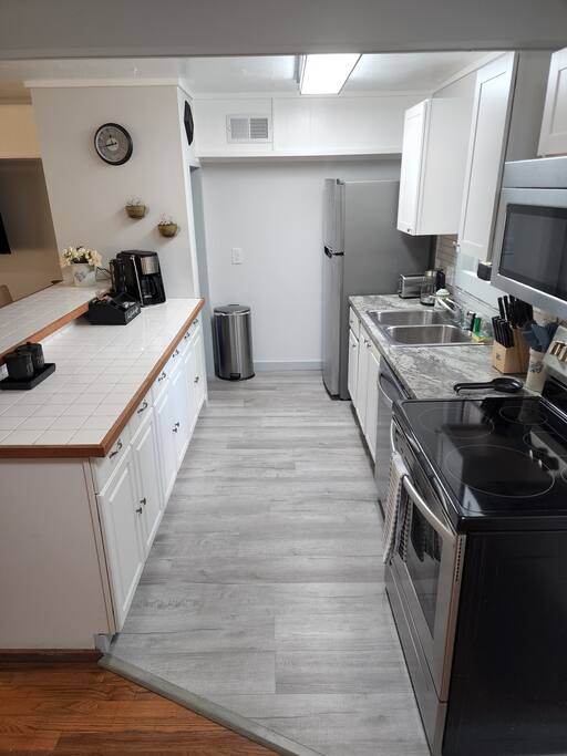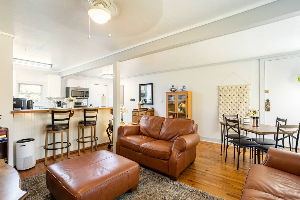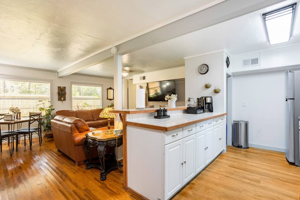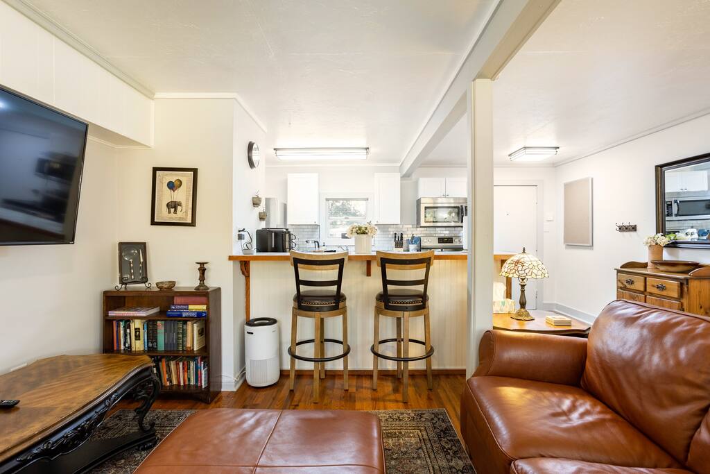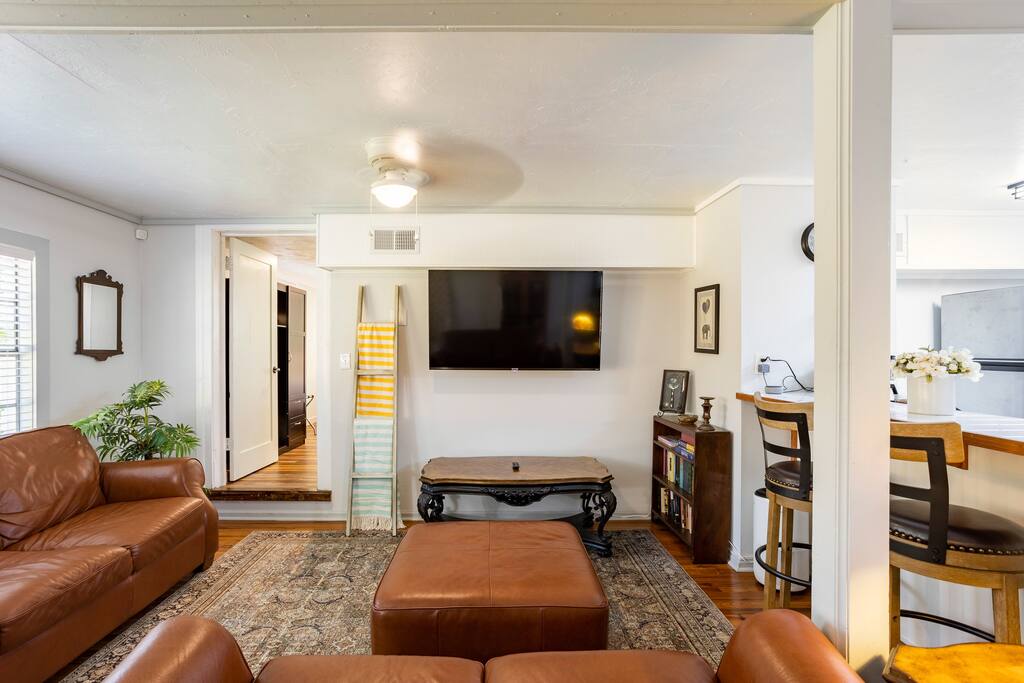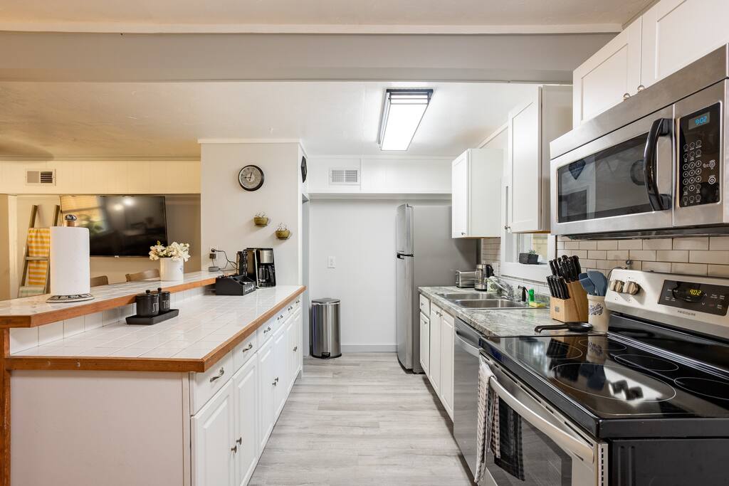 The home features a comfortable bedroom, a full bathroom, a cozy living room, a bright dining space, and a fully equipped kitchen stocked with everything you need for home-cooked meals or quick bites. The backyard is shaded and private — ideal for morning coffee, evening drinks, or a little play time with the kids. You’ll find soft linens, blackout blinds, a washer/dryer, Wi-Fi, and a smart TVs for streaming your favorite shows. We’ve added books, board games, and a few toys to make family stays even more relaxing.